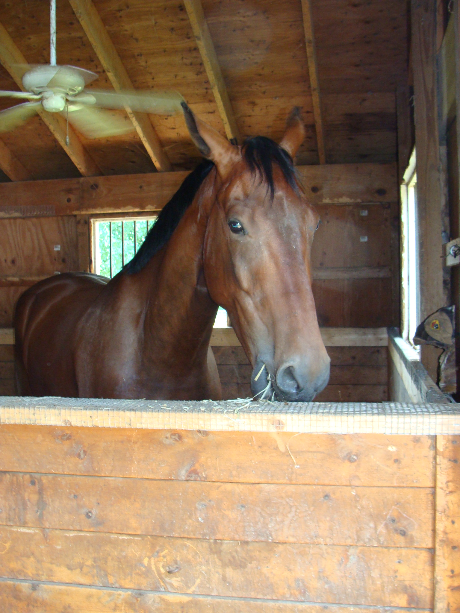 My plan for the day was an easy workout since he’d just eaten and it was another hot day. I read an article with Christopher Hess in my newest Dressage Today magazine where you would ride a square and perform a quarter turn on the haunches in each corner to start the next side of the square. The exercise would be performed in each direction. Sounded simple enough, but the exercise assumes that your horse will halt and wait for the rider’s aids to make the turn. Halts were challenging today. I’d ask and Ike would giraffe his neck and pull on the reins with those powerful “underneck” muscles. Pppllbbbttt (the sound of Ike sticking his tongue out at me). Ike would stomp his hooves, back up, push into my leg with the hind end, walk forward, back up again, anything to avoid halting. I sat quietly and repeated my request until all movement would stop. I abandoned the idea of any turns and concentrated on halts – obedient, quiet halts all while being patient and waiting for my next aid. After 15 minutes of fuss, we had our first halt. Phew, that was the hardest I have EVER worked for a halt. Ike finally relented and we made progress. We then trotted on and tried some centerline halts; Ike’s tantrum was over and Mr. Cooperative returned. The boy can nail those halts when he sets his mind to it.
