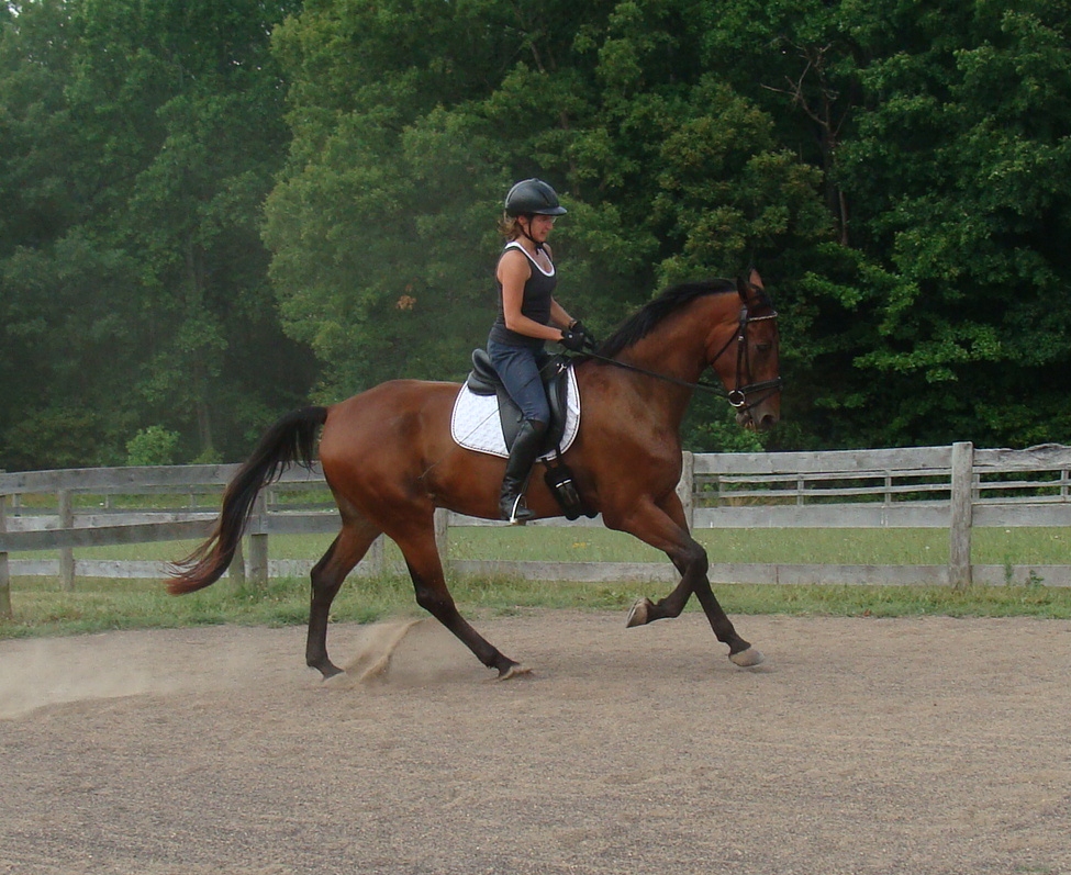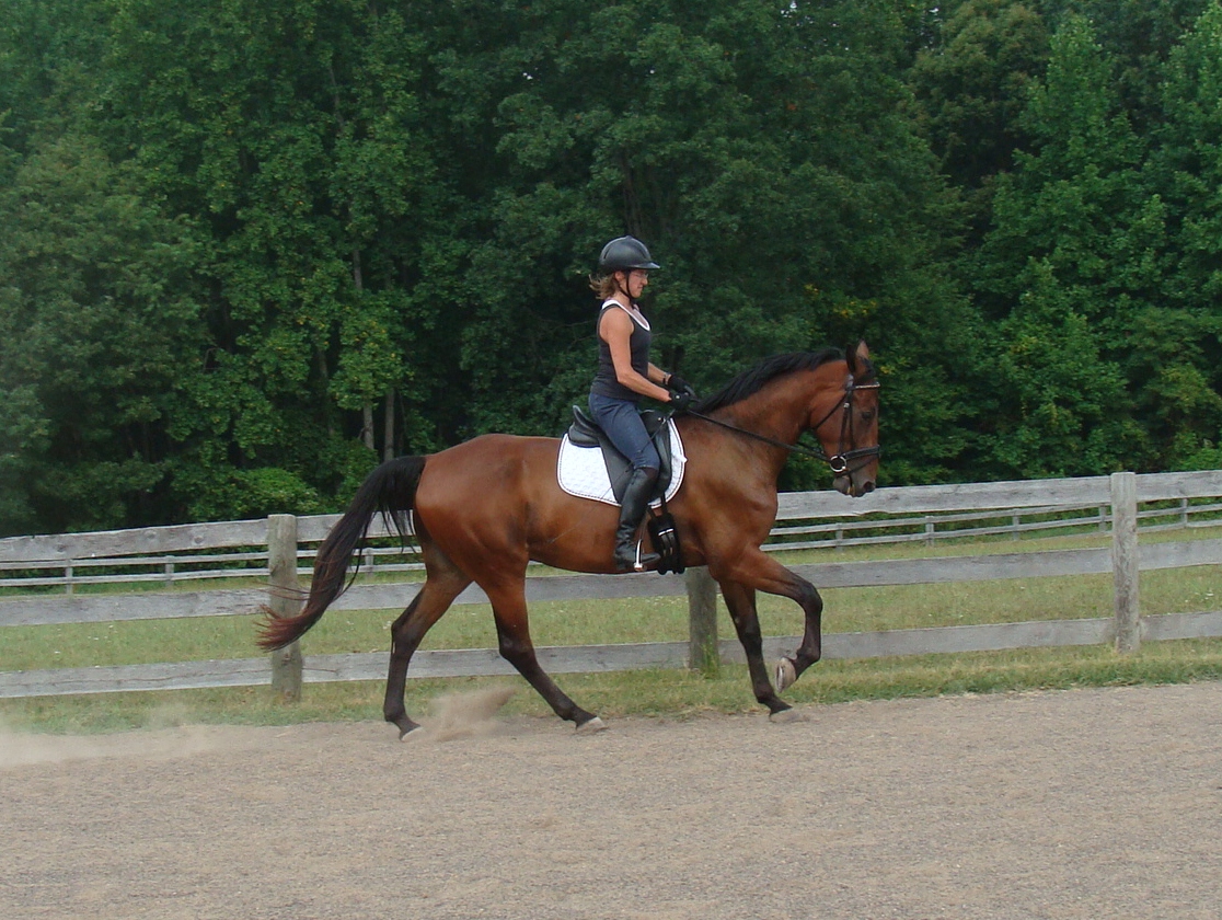 Today was a gorgeous day for my dressage lesson. We are continuing to school the Training Level canter transitions. Thankfully, the horse and rider are better all the way around and the correct lead happens 9.5 times out of 10. We still occasionally get disunited, so we get partial credit. The down transitions are also improving. Six months ago, Ike’s legs would flail about and I’d have the reins too loose to be of any help to him. Now, I am more help and it is much less “herky-jerky.” Really hoping that we can see some better scores for the canter movements. Just clearing the 60% margin would be thrilling. Ms. C tells me that my reins are still too long in my canter-to-trot transitions…aarrrgghhh. Can I blame sweaty reins? Yeah, I know, I need to do better. Here here is another photo of Ike’s right lead canter: