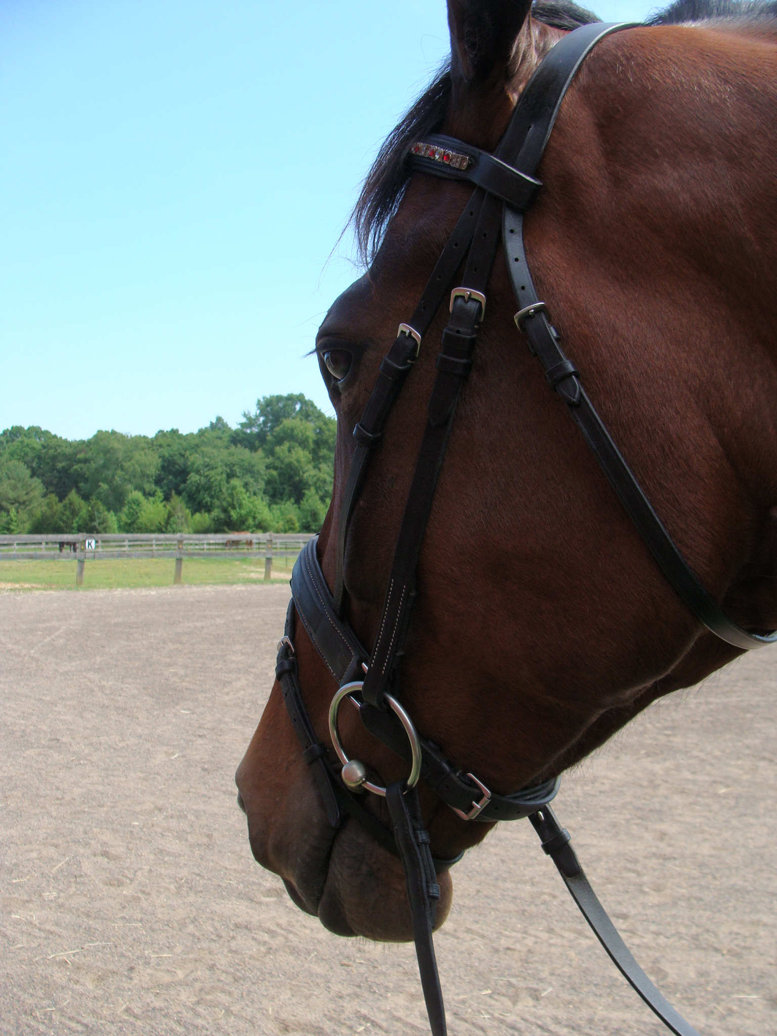 And then I was offered an amazing opportunity to try a European brand of bits that are just entering the US market – thank you to the Florida reps for the Neue Schule Company [German for New School and pronounced “Noya Shoola”] for allowing Ike and I to be American guinea pigs for your products. I shared details of our adventures with the representatives – Ike’s age and training, what bits we have tried before, and how he feels while I ride. Yes, I even told them that I feel like I have to carry him around the arena. Based on the information I provided, they sent us their Verbindend bit to try: http://nsbits.com/global/index.php/dressage-legal/verbindend.html.