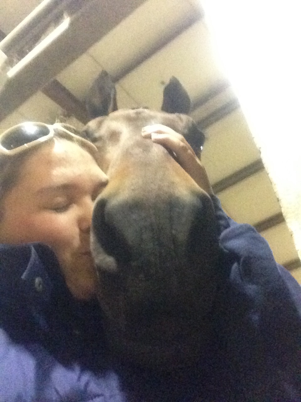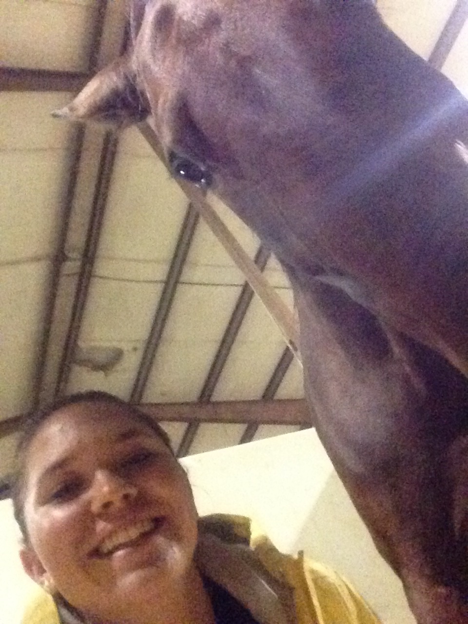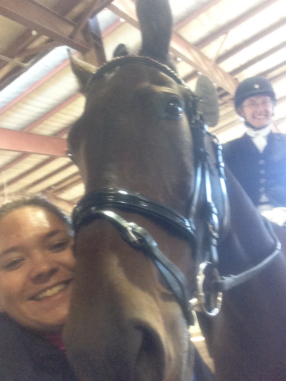Being at the show was a lot of fun, but by the end of the weekend I was really tired of being inside all the time. We horses need to start a union and get some better benefits – stalls with attached paddocks will be on my list of demands. An internet connection at the barn, a private apple orchard, and a climate-controlled barn will also be discussed. And none of that pay-for-performance stuff. I get my pay and benefits regardless of the color of the ribbon. But I digress…My friend Winslow was there as were Roo and Flori. Dad came along as well as my canine brother Tim. Ms. C was there to cheer for me on Saturday. It was big fun to have Miss Melana visit me at night. We had fun sending photos to Mom.