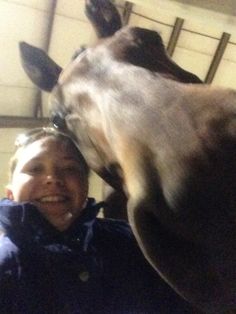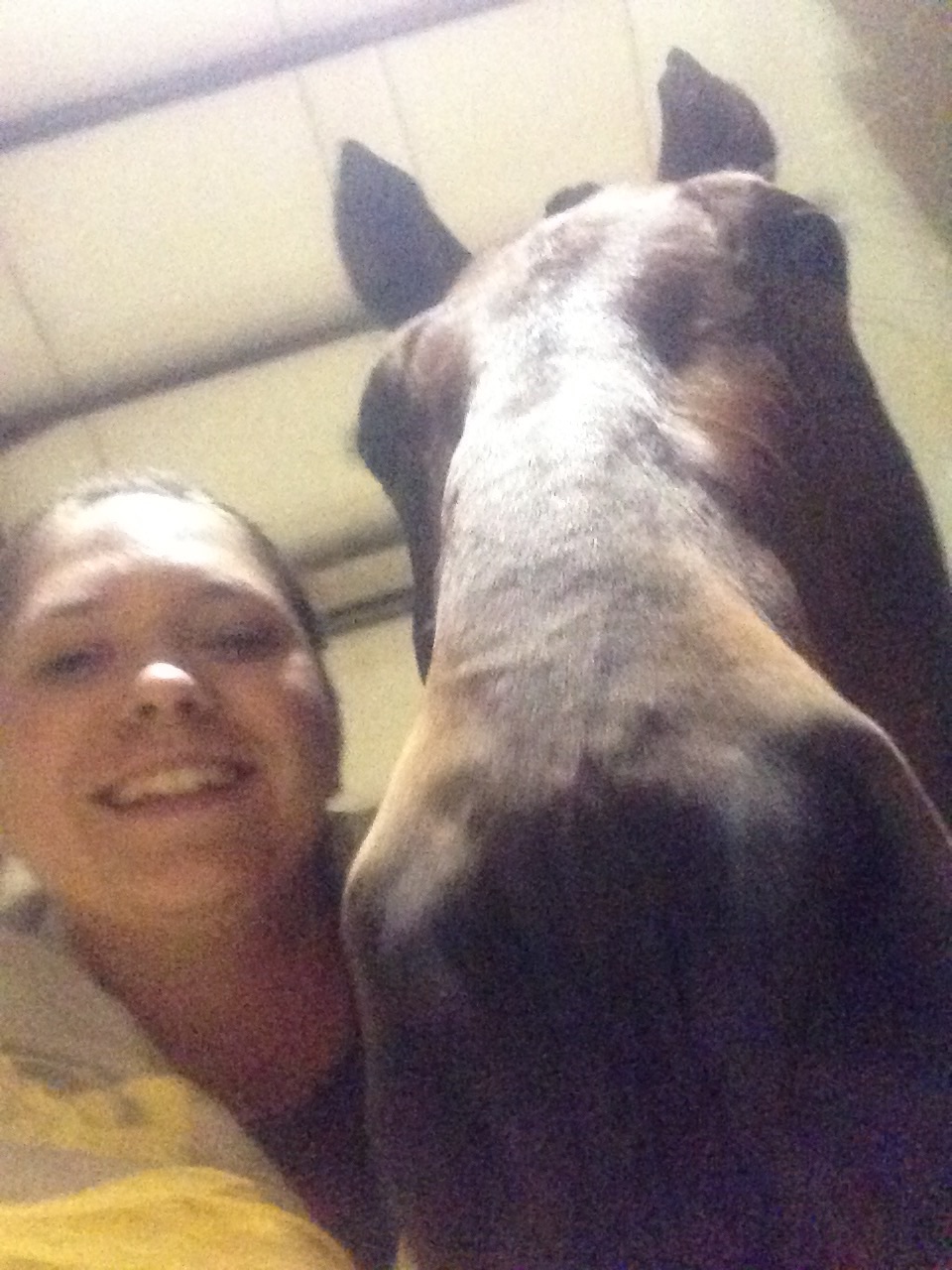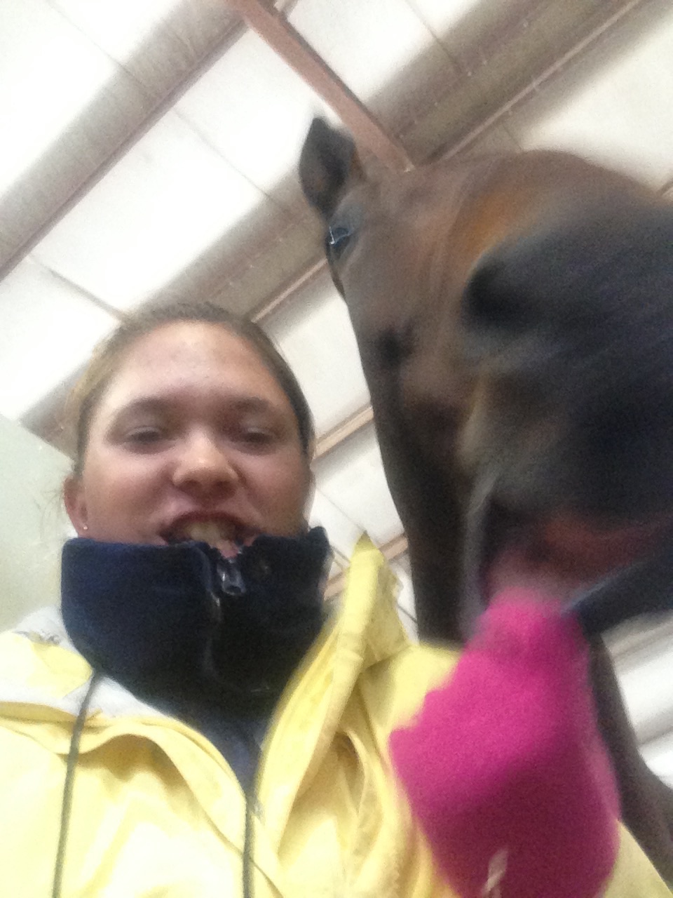 Being at the show was a lot of fun, but by the end of the weekend I was really tired of being inside all the time. We horses need to start a union and get some better benefits – stalls with attached paddocks will be on my list of demands. An internet connection at the barn, a private apple orchard, and a climate-controlled barn will also be discussed. And none of that pay-for-performance stuff. I get my pay and benefits regardless of the color of the ribbon. But I digress…My friend Winslow was there as were Roo and Flori. Dad came along as well as my canine brother Tim. Ms. C was there to cheer for me on Saturday. It was big fun to have Miss Melana visit me at night. We had fun sending photos to Mom.