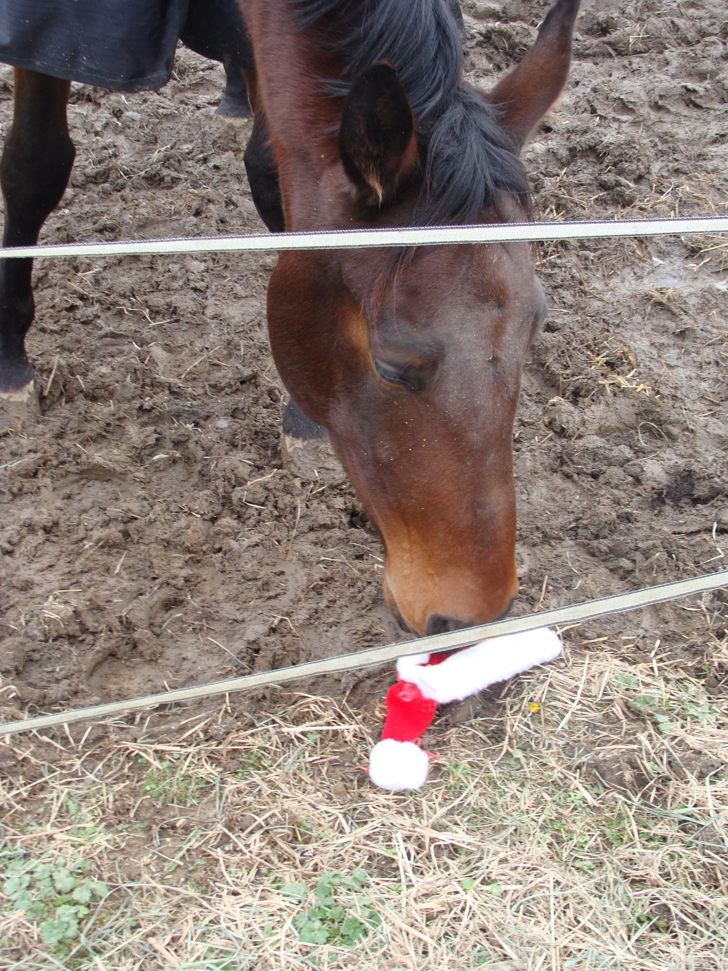 Step Four, Day Two – Retrieve hat from mud. Mutter expletives under breath while trying to clean Santa hat and spy horse passing judgment on this holiday activity.