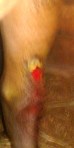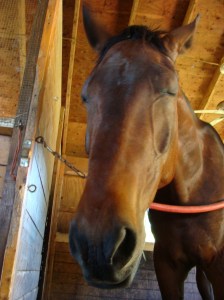 By the time I arrived at the barn, the horses were safely tucked in their stalls. They were all happy to see me, “the treat lady is here!” I quickly handed out treats (the bucket bangers would have been inconsolable had they not been given a snack…yes, I’m well-trained). I put Cigar’s halter on and did my best to get a close look at the leg. Yes, it was bloody looking, but thankfully, Ms. C and Mr. D had already cold-hosed the leg, sprayed it with a topical medicated spray, and given Cigar some bute. Unfortunately for me, Cigar knew my motive for being in his stall, so he was less than cooperative. Every time I got too close to the leg, he would cock it as if to say, “go ahead, I dare you to touch it.” Hmm, I did managed to snap a grainy photo with my phone (forgot the camera in my rush).