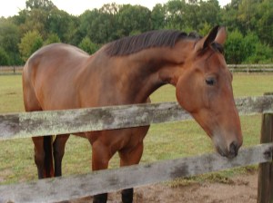 The horses had very limited turn out yesterday morning before the rain and wind picked up and had them begging for the safety and dryness of the barn. I can tell you – they knew the storm was coming. Ms. C and Mr. D said that they were keyed up as they were led to their paddocks and most confined their antics to their own paddock….and then there was Ike’s brother Cigar. Cigar is one of those Thoroughbreds, you know the ones I mean, the screw is loose and sometimes falls out and rattles around the brain. Cigar jigged on the way to his paddock, reared up, and pulled away from Ms. C as if he was breaking from a starting gate. He managed to get into a brawl with Ms. C’s mare who was being led to her paddock. They fought like banshees. Ms. C and Mr. D finally got them separated and Cigar herded back to his paddock. By this time, he was fired up and passaged over to one of the ponies and kicked at the fence. Somehow, during the melee, he managed to tear up the front of his left hind leg…great. Frankenstorm is on her way and I’m headed to the barn praying that I don’t have to call the vet for the fool.